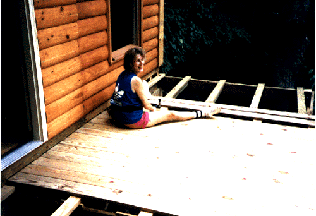Here is a view of the extension of the porch floor out into space from the front of the cabin. It is built along the 24-foot length along the front of the cabin and extends out 8 feet over the fast-dropping downslope.