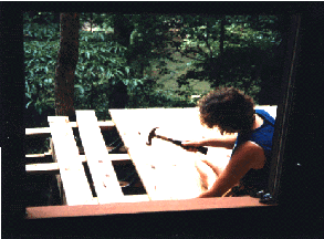 Note the tree-like post around which the planking is being installed. This is one of those two "straight" whiteoak trees which had been placed downslope to support the edge of the porch and eventually, the porch roof. (Doesn't look too straight, does it? Oh well, as we often said: