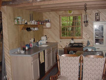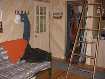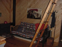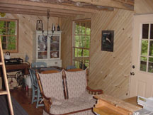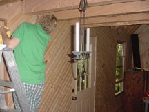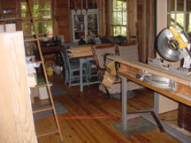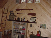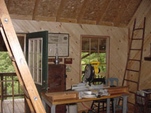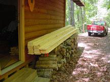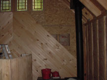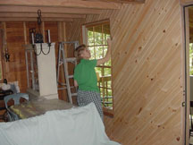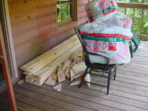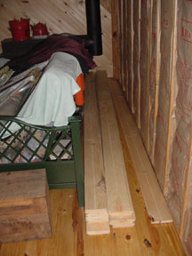 After thinking about various paneling options, we decided on 6" wide white-pine boards as the wall covering we wanted. Then we found a way to trim the boards at 45-degrees and decided that we could put the wallboards up on a diagonal. These photos show the wood strips, some 8', some 10', some 12' long, all stored throughout the cabin ... outside the back door, on the front porch, and inside, respectively.