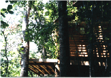 Here is a view of the extension of the porch floor out into space from the front of the cabin. It is built along the 24-foot length along the front of the cabin and extends out 8 feet over the fast-dropping downslope.