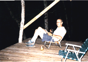 Note the tree-like post around which the planking is being installed. This is one of those two "straight" whiteoak trees which had been placed downslope to support the edge of the porch and eventually, the porch roof. (Doesn't look too straight, does it? Oh well, as we often said:
