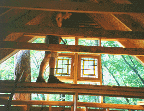 The 4 little antique windows will provide some light to that end of the cabin. Here are the first two being installed