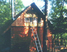 First a scaffold had to be built which could support the ladder needed to reach up to the roof peak from the sloping ground alongside the cabin side. Note the 12-foot long 2x4s used as the supporting legs. Kind of a wobbly set-up.